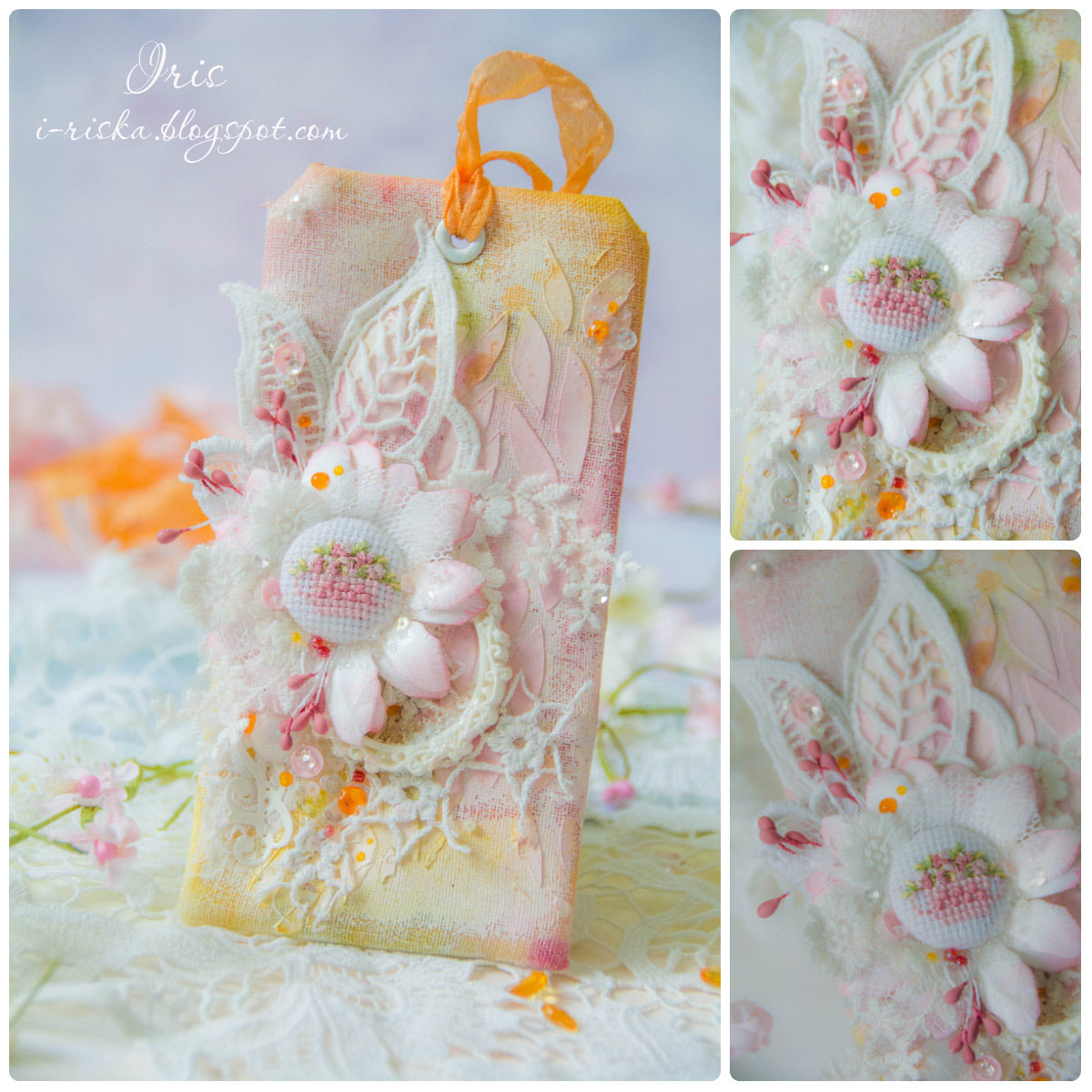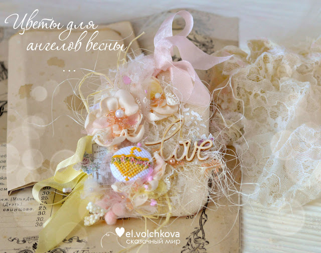 - делаете свою открытку или тег с ОЭ. Тема этого этапа - рукодельные цветы! ОЭ - ОЭ - самодельные цветы из невесомого, легкого кружево, фатина.